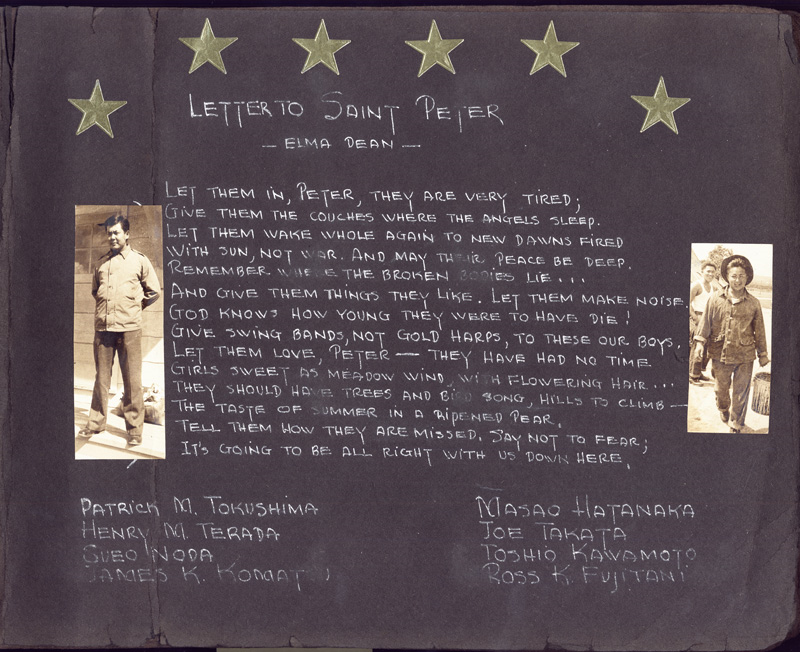 One of the most poignant images was from an album created by William Takaezu. On the first page he had copied a poem titled “A Letter to Saint Peter” that was written in 1942 by an Oakland, California woman named Elma Dean. In a December 1961 interview that appeared in the Oakland Tribune, she recalled that the war was not going well for the United States. The poem conveyed her sorrow for the young men who were being killed, included some of her friends’ sons. Takaezu then listed eight of his friends who had been killed, including Shigeo Joe Takata, the first 100th soldier to be killed in action on September 29, 1943. A photo of two of his friends flanked each side of the poem.